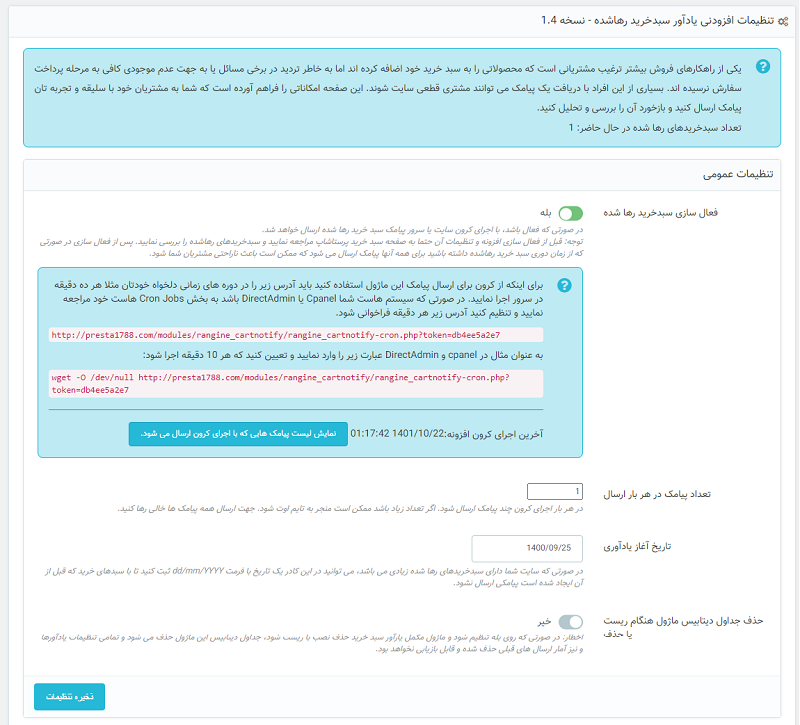 افزونه یادآور سبد خرید رها شده، پس از نصب یک صفحه در ماژول پیامک رنگینه ایجاد می کند که شما می توانید به تعداد دلخواه، یادآور یا کمپین ایجاد کنید. آدرس مخصوصی نیز برای ثبت در کرون سایت یا هاست وجود دارد که پس از ثبت آن، به صورت خودکار در فواصل زمانی که مشخص می کنید یا تنظیمات دیگری که یادآور دارد، پیامک خودکار به مشتریان سبدخرید رها شده ارسال می شود.